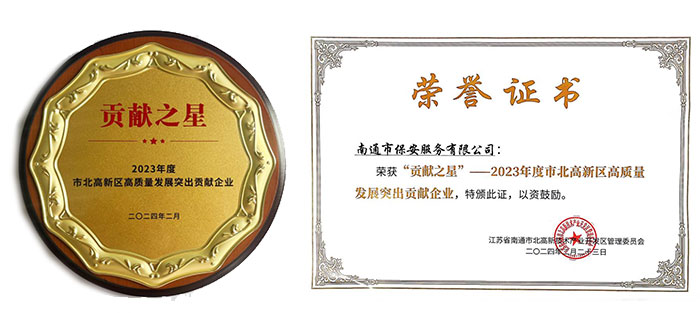 ——南通保安公司榮獲市北高新區(qū)“‘貢獻(xiàn)之星’--2023年度高質(zhì)量發(fā)展突出貢獻(xiàn)企業(yè)”稱(chēng)號(hào)