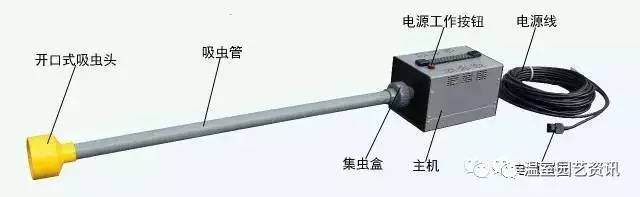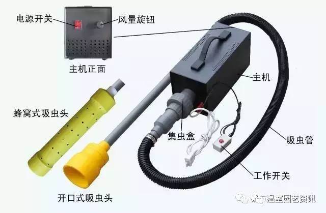 設(shè)備分為吸蟲頭、吸蟲管、集蟲盒和主機(jī)四大部分。主要是利用白粉虱、薊馬等這類微小害蟲的趨色性、體重輕等生物特性,通過物理的方式來(lái)將其捕殺。趨色性原理是根據(jù)害蟲對(duì)顏色有強(qiáng)烈的趨向,喜歡聚集到黃色或藍(lán)色物體表面,如白粉虱、蚜蟲等喜歡黃色,薊馬等喜歡藍(lán)色。通過這個(gè)原理將吸蟲頭做成藍(lán)色和黃色,就能有效的吸引害蟲。同時(shí)利用這類害蟲體重小、輕的特點(diǎn)通過高速負(fù)壓吸取的方式將這些會(huì)飛的小型害蟲抽取到特定的集蟲盒內(nèi),抽取過程中害蟲與吸蟲管劇烈撞擊,從而使害蟲身體分解、粉粹達(dá)到滅殺效果。